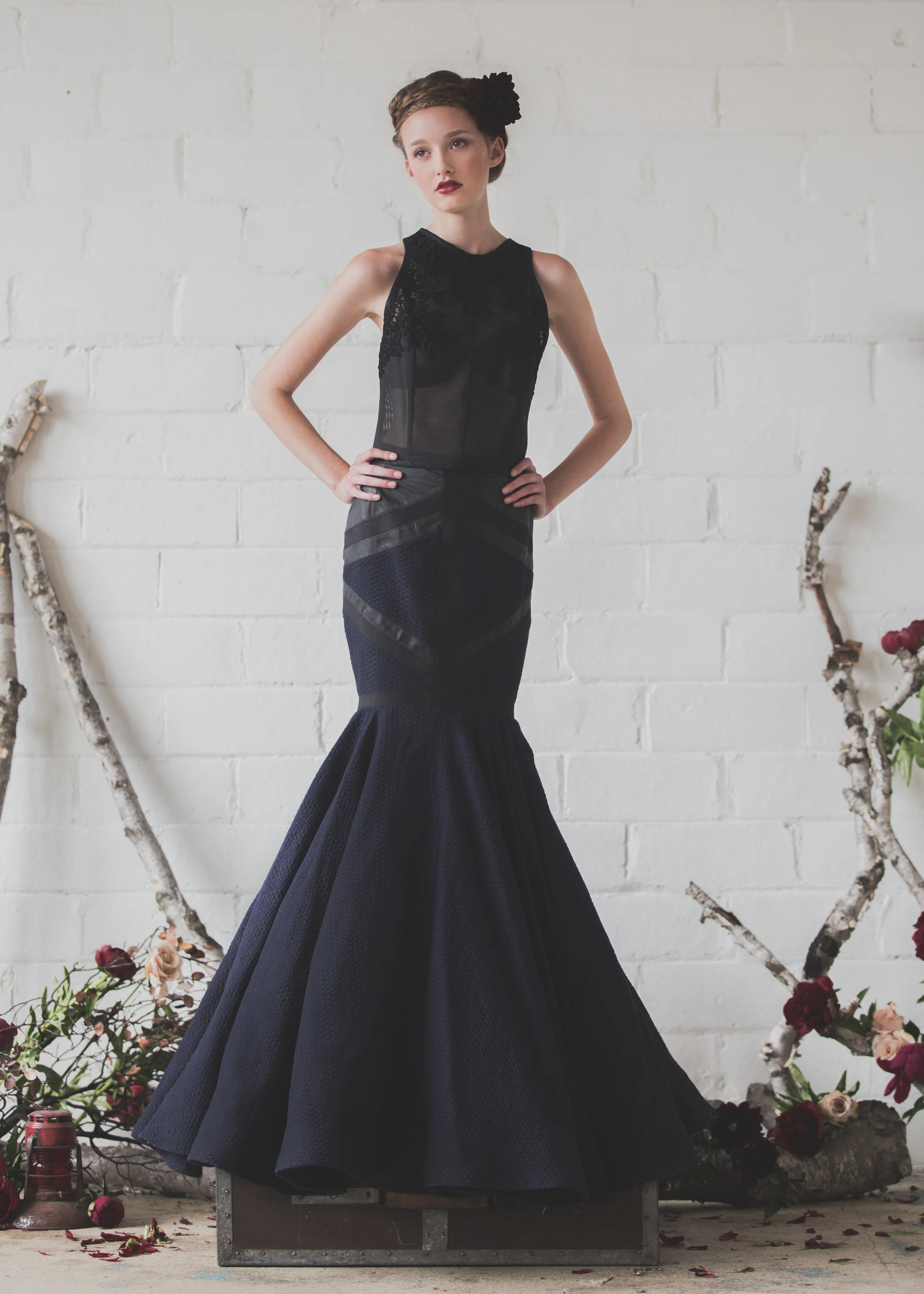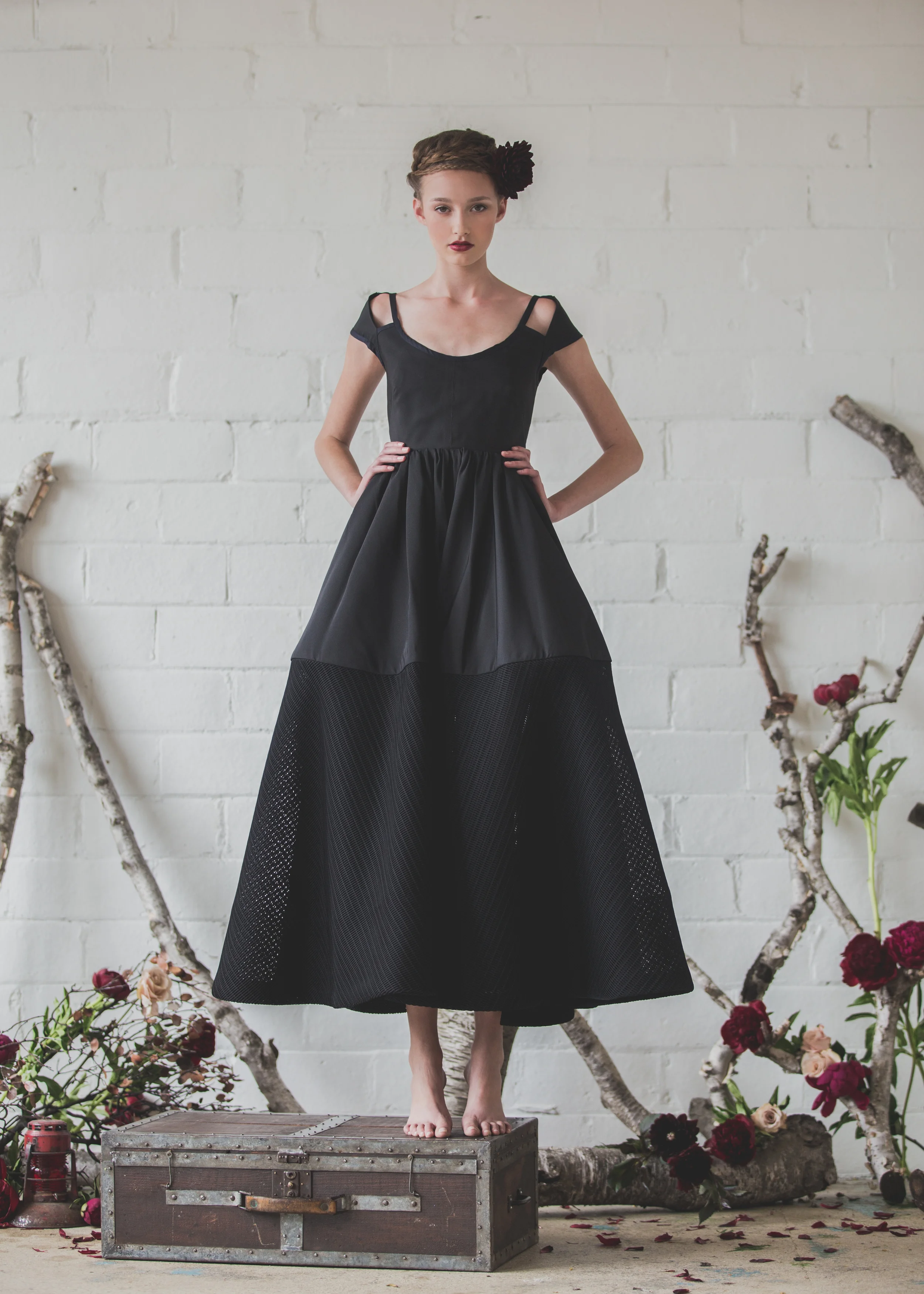 Velveteen Rose is inspired by Emily’s mother’s grim childhood. The collection’s dark color palette, multiple textures and playful silhouettes combine to evoke a broken innocent milieu while remaining feminine and wearable.